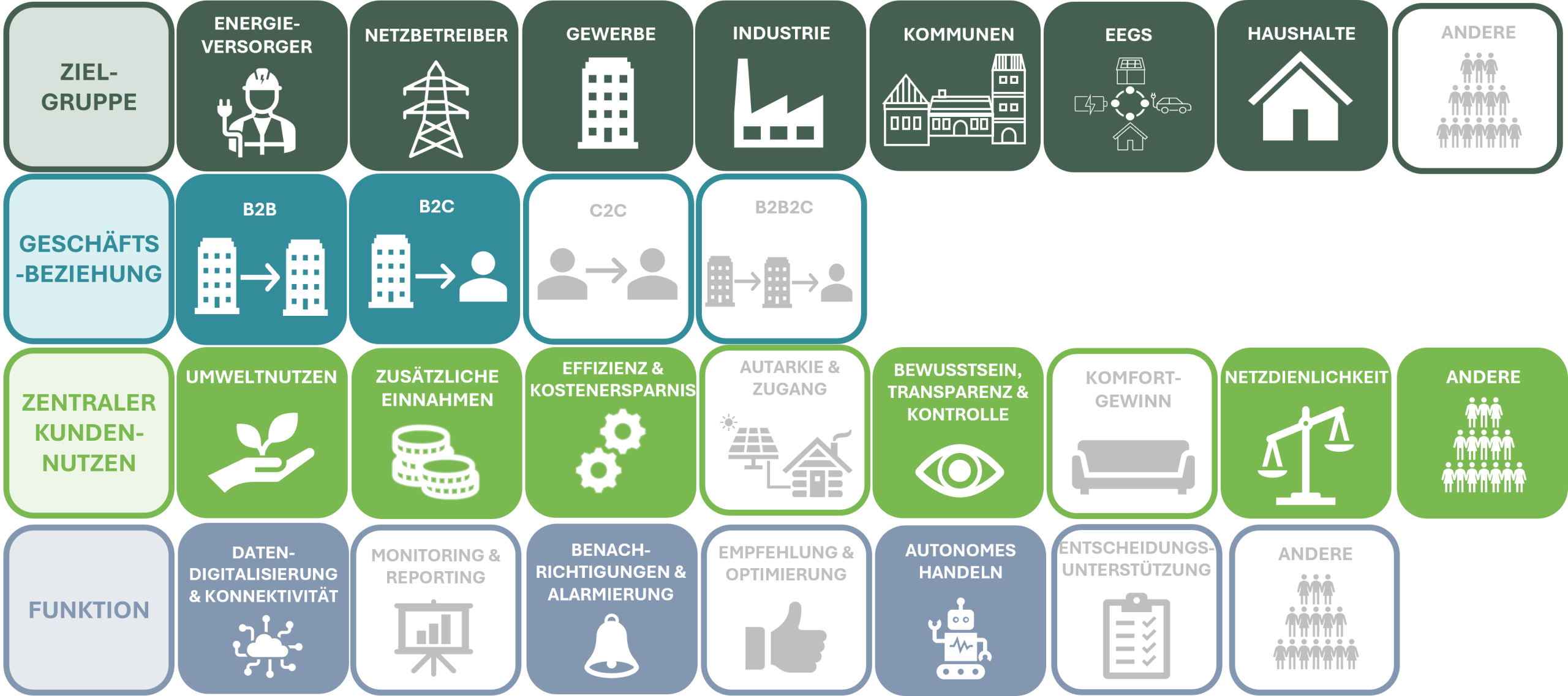 Daten des Aggregators: Diese umfassen Anfragen für Dienstleistungen und Schaltbefehle, um die Flexibilitätskomponenten zu steuern, Anfragen für Zeiten, in denen bestimmte Flexibilitäten blockiert sind und nicht genutzt werden können, sowie Identifikations- und Vertragsinformationen, die während des Registrierungsprozesses ausgetauscht werden